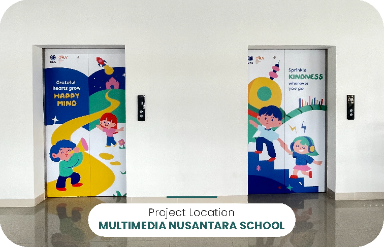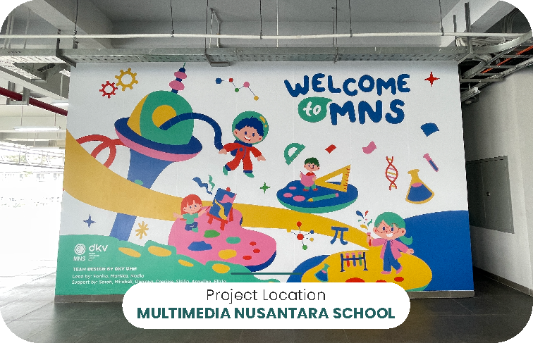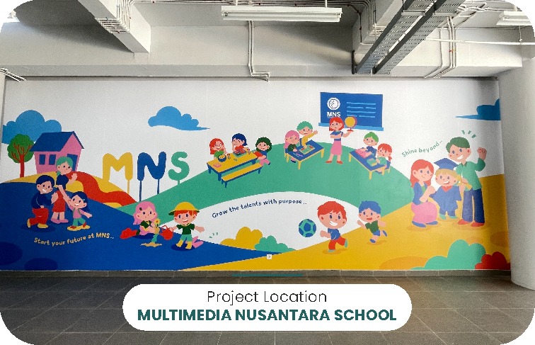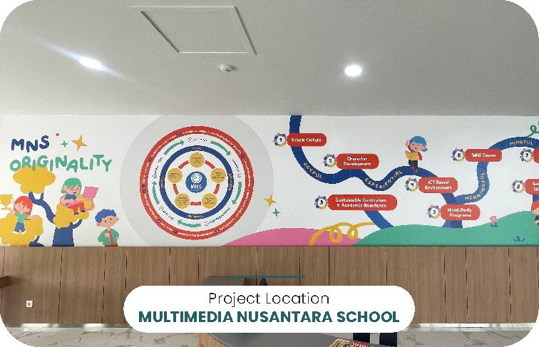 Ruang belajar jadi lebih inspiratif dengan wallpaper custom di Multimedia Nusantara School desain edukatif yang mencerminkan semangat kreatif siswa.